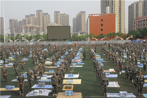 参赛人员从宿舍带好自己的被子,各式各样的被子给单一色调的操场增添了几分明亮的色彩。在比赛前的热身时间中,同学们反复练习叠被子的手法,找到自己最佳的状态去应对比赛。