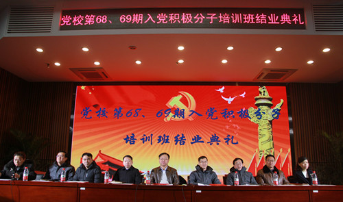 1月5日中午,党校第68、69期入党积极分子培训班结业典礼在我校图书馆多功能报告厅举行。学校党委副书记陈超、党校副校长陈方、各二级学院党支部书记等及培训班全体成员参加了本次结业典礼。典礼由培训班班主任李蕙主持。