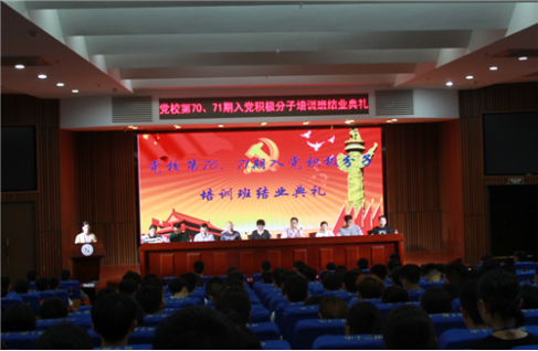 本网讯 6月28日中午,党校第70、71期入党积极分子培训班结业典礼在图书馆多功能报告厅隆重举行。本次典礼由培训班班主任李蕙主持,学校调研员刘琼教授、党校副校长陈方及各二级学院党总支书记或学生支部书记出席本次结业典礼,培训班全体学员参加了结业典礼。