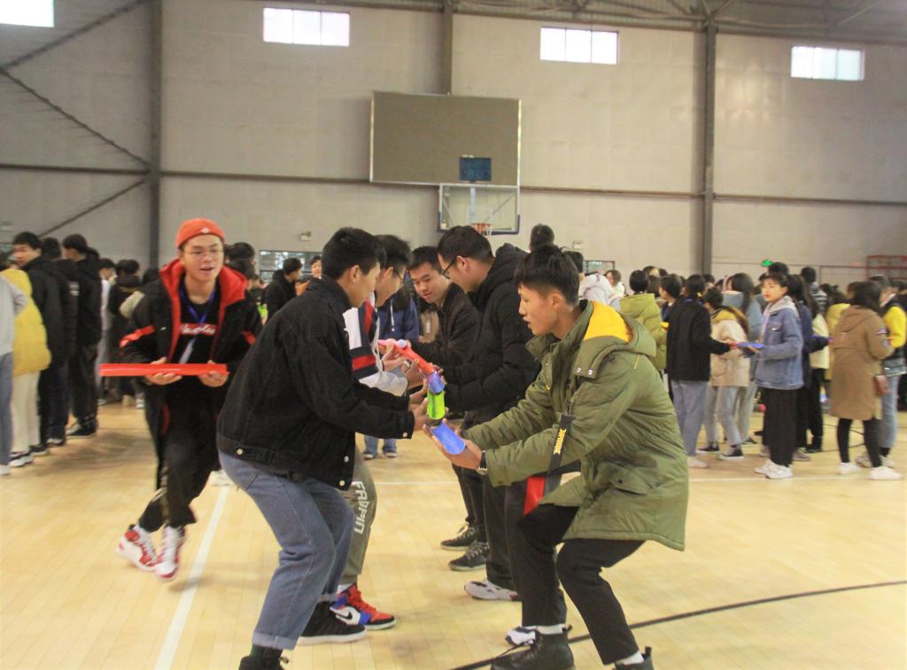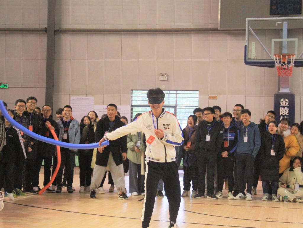 引发全场欢乐气氛的蒙眼打怪项目,由每组各派十名学员参与比赛,选手依次蒙眼上场,利用海绵棒击打对方选手,被击打者淘汰出场,最短时间内成功淘汰对方十名队员即为获胜。选手们在比赛过程中由于双眼被蒙住,全程听取本小组成员指挥,同样观众们也在一旁为选手们出谋划策,支持自己喜欢的选手。在“手忙脚乱+珠行百里”的项目中,学员们各挥其能,四肢灵活且党性知识储备量高的同学与平衡力好的同学组成一队齐心协力将球珠运到终点。而在“智慧大脑”的比赛项目中,考验的则是学员们的反应速度和党性知识储备量。