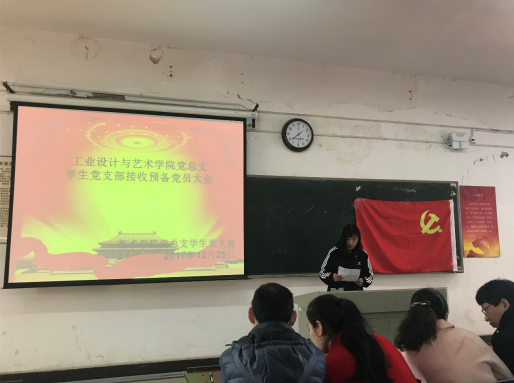 2017年12月26日下午,工业设计与艺术学院党总支学生党支部在2504教室召开接收预备党员大会,参加本次会议的有工业设计与艺术学院党总支书记郑志凌书记、学生党支部书记陈丽萍老师、党员老师、预备党员、发展对象以及入党积极分子。本次会议由何优主持。