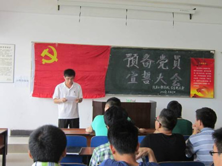 接着,新党员代表彭辉振、老党员代表钟玉京以及入党积极分子代表杨志明依次在会上作了发言。新党员代表彭辉振在发言中表示,作为一名预备党员要坚持党的理想信念,不断加强学习,做好本职工作,并时刻以身边的党员为榜样,严格要求自己。同时将铭记此刻在党旗下的庄重誓言,在以后的学习、生活和工作中将更加积极努力,多做贡献。钟玉京代表老党员在发言中也作了表态,他表示,作为一名学生党员,将更加严格要求自己,为学院、为支部贡献自己的力量。入党积极分子代表杨志明在发言中表明了向党组织靠拢的决心。他说,作为一名入党积极分子要以党员为榜样,坚持学习,并做到持之以恒,不仅要从组织上入党,更要在思想上入党。