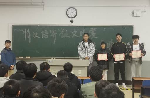 刘骏鹏老师为此次获奖的同学进行颁奖并发表讲话。他首先赞扬了同学们的劳动成果,并鼓励同学们积极参与创作当中,写出更好更多的优秀作品。他说道:“书信这一文化是我们不可丢弃的,我们应该多举行这样的活动,让同学们参与进来,用书信表达对家人,对朋友等难以言表的情感。”