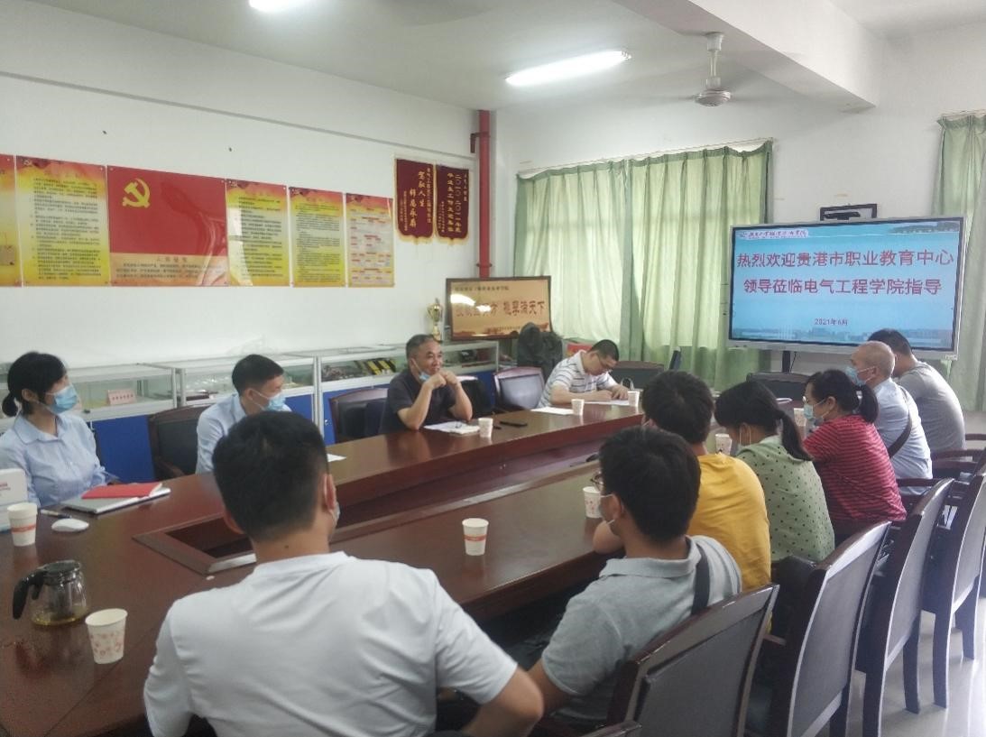 贵港市职业教育中心此行目的主要是为了促进该市学校的电子电器应用与维修专业(群)的发展。首先,电气学院李德尧院长就电气工程学院的基本情况作了简单介绍,并对我校在教学、实验室建设过程中的经验进行了分享。然后,调研小组就高职院校机电一体化技术、工业机器人技术等专业课程建设工作、专业教材建设与资源库建设工作、毕业生就业情况进行了调研。