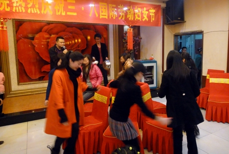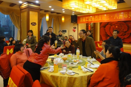 游园活动结束后,女同胞们与各分工会主席欢聚一堂共同进餐,并进行了“击鼓传花”、“抢凳子”等小游戏,餐厅内欢笑声、歌声不断,成了一片欢乐的海洋。院党委书记廖洪元、党委副书记龙承海、副院长刘继平、纪委书记李玲、工会主席张志勇、学院调研员刘琼等院领导出席聚餐,并参与到游戏中来。聚餐的欢乐氛围在副院长刘继平高亢的歌声中达到顶峰。