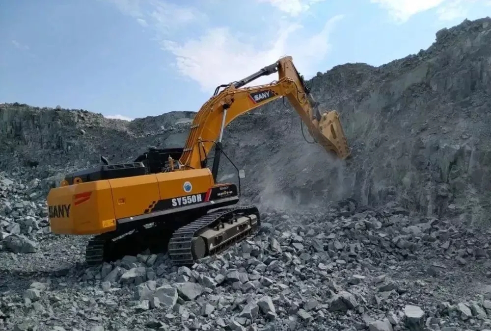 SY550H型履带式液压挖掘机,标配200破碎锤,专用控制程序为破碎模式匹配最佳参数,深度满足矿山破碎作业,五大结构件寿命均超2万小时,是大型露天矿山超高效破碎作业的又一新利器。