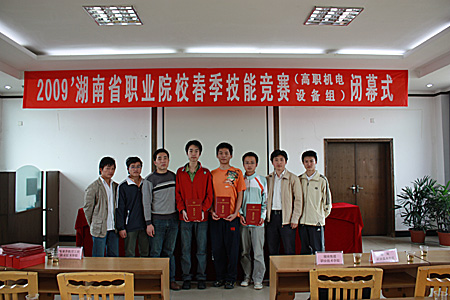 • 我院参赛选手和指导老师合影 我院参赛选手罗杨、尹宏华、沈小淳     4月27日,2009’湖南省职业院校春季技能竞赛数控机床装配、调试与维修项目在长沙航空职业技术学院顺利闭幕。