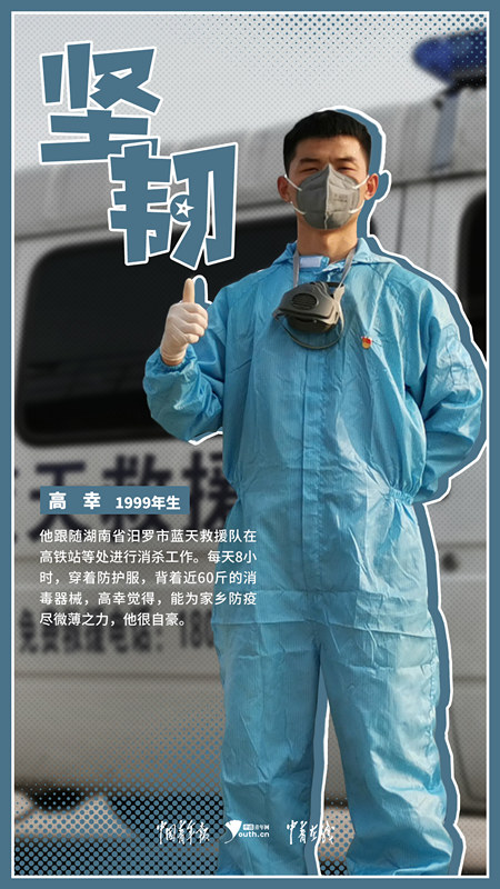 本网讯 身着防护服,背着近60斤的消毒器械,一天8个小时的消杀工作,手被腐蚀得发白脱皮……中共预备党员、我校汽车制造专业2018-1班高幸是一名汨罗市蓝天救援队的志愿者,他的事迹被学习强国、中国九游·官方网站网、湖南共青团微信公众号等媒体报道。就在不久前,高幸被《中国青年报》选为“坚韧”的代言人,在中共湖南省直机关工委出品的《湘直青年暖春行 堪当重任90后特辑》中,他的标签为“有信念的人,不惧一切”。