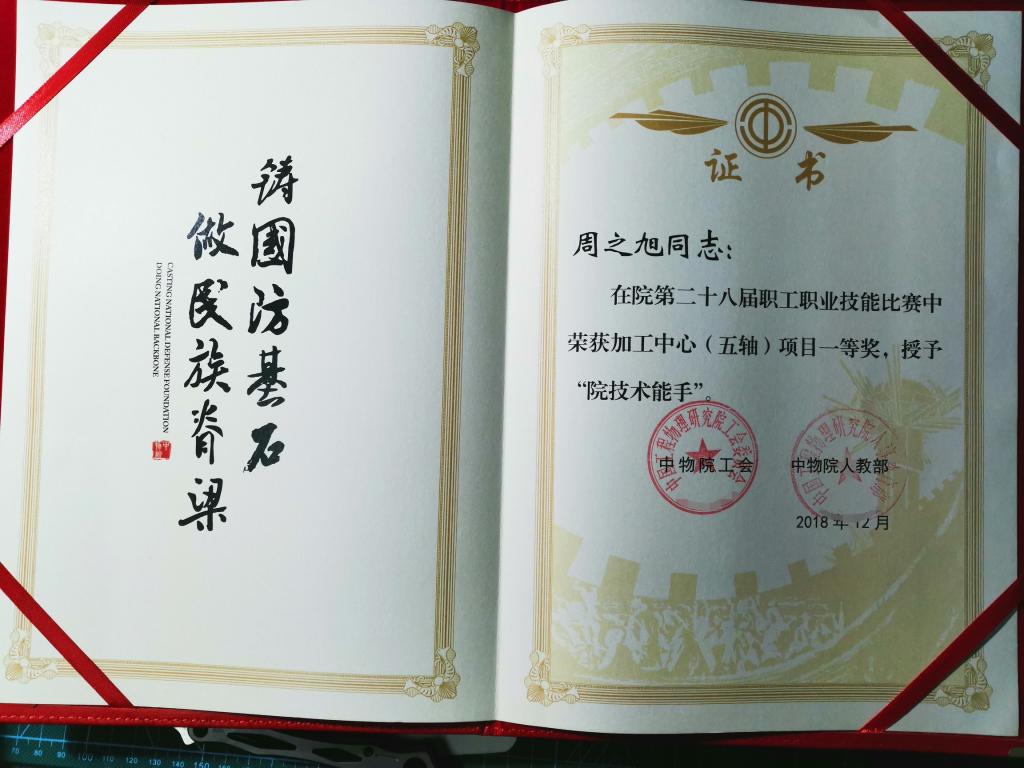 “整个比赛的过程中是比较辛苦的,我不仅要保证日常工作的顺利完成,还要花费额外的精力与时间去磨炼自己的专业技能。在这半年的时间里,我几乎没有休息过一天。”周之旭说道。功夫不负有心人,经过不断的努力,在2018年中国工程物理研究院职工职业技能比赛中,周之旭获得了五轴项目的第一名,被授予“院技术能手”的称号。