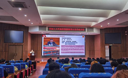 本网讯 3月24日上午,我校图书馆报告厅座无虚席,一场别开生面的思政课正在这里进行。全国人大代表、湖南中医药大学科技处副处长、博士生导师庹勤慧教授正为我校师生宣讲全国两会精神。来自全校各院系的400余名学生和马克思主义学院全体教师一道聆听了此次宣讲会。