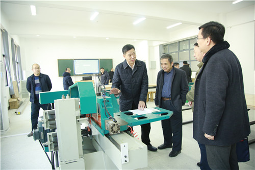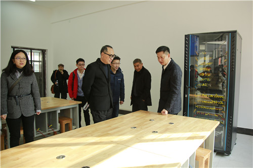 调研现场,向罗生一行查看了三栋大楼的会议室、教室、理实一体实训室等场所,对室内简洁明亮的空间布局、合理的功能分区、人性化的设计理念表示赞赏。在敏行楼实训教室,信息工程学院陈鸣老师介绍,针对学院师生上课笔记本电脑使用率较高这一特点,他们协调施工方,为每个工位设置了双电源和双网络,同时将电源线和弱电线桥架倒扣安装在橡木实木桌面的底部,整个教室基本看不到明线,更加简约美观。向罗生表示,这样的设计充分展示了工业设计之美,是对学生的示范和引领,将在学生心中埋下发现美创造美的种子。