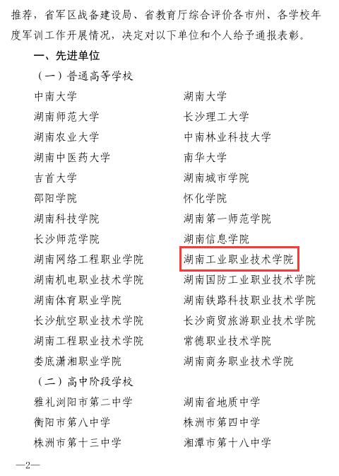 本网讯 近日,湖南省军区战备建设局、湖南省教育厅发文,对在2021年全省学生军训工作考评中取得优异成绩的28个普通高等学校和27个高中阶段学校予以通报。我校获评2021年全省学生军训工作先进单位。