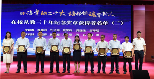 本网讯 “今天,我们讲述老师的故事,走进这美丽的心灵;今天,我们唱响红烛的赞歌,向最美的园丁致敬。”9月9日,我校1102报告厅被温暖与感动包围,2022年学校教师节庆祝大会在一首学生朗诵的诗歌中拉开帷幕。本次大会首次颁发从教30年纪念章、举行荣休仪式、新进教师宣誓仪式,表彰在各领域作出重要贡献的教职工代表。大会设1个主会场和2个分会场,党委书记刘建湘、校长向罗生等全体校领导、全体教职工参加此次盛会。