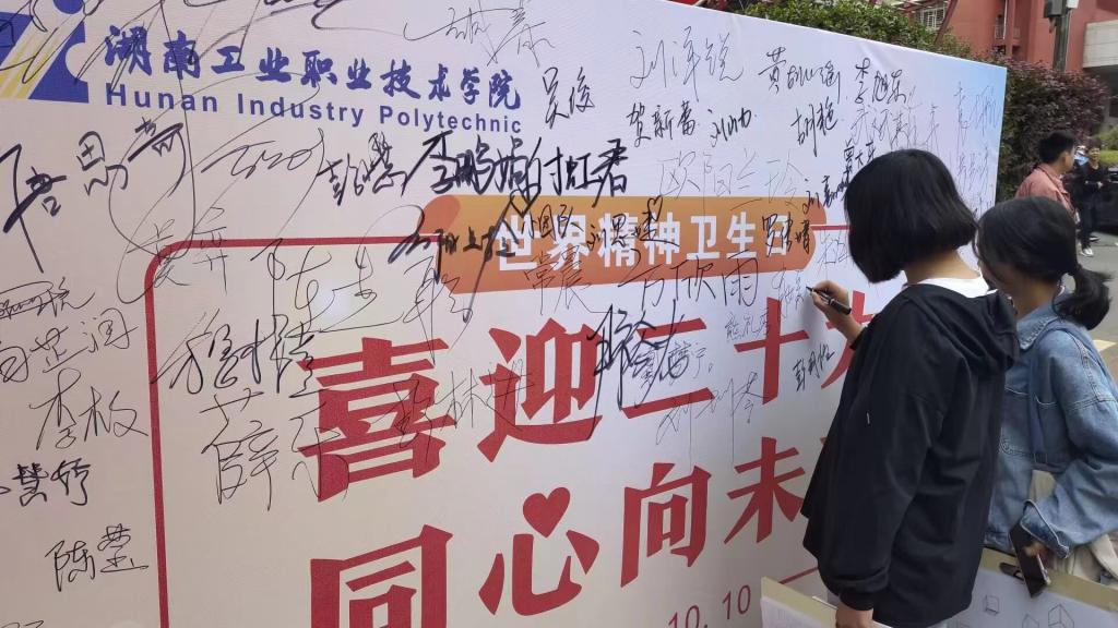 本网讯 千人签名、心理健康科普小知识海报展示、“爱的抱抱”快闪活动、“我听你心声”朋辈树洞营活动……近日,第31个世界精神卫生日到来之际,为营造师生关注心理健康的良好氛围,学校组织开展了“喜迎二十大,同心向未来”为主题的心理健康教育宣传活动,全校师生积极参与。
