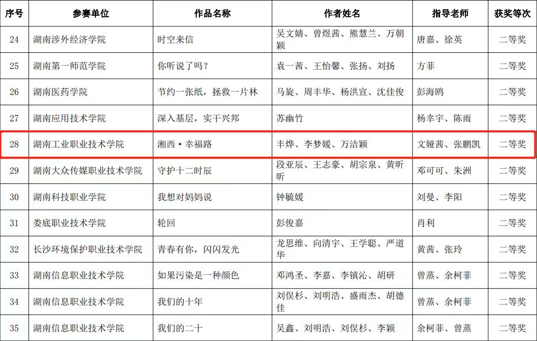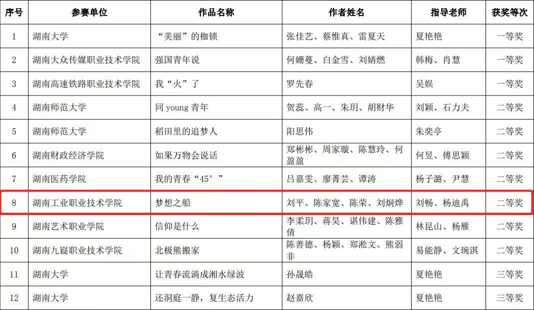 本网讯 近日,湖南省第九届大学生公益广告大赛获奖结果揭晓。我校参赛作品《乡村振兴路上的十八洞村》荣获大赛一等奖,《湘西·幸福路》、《梦想之船》获大赛二等奖,《为地球做件小事》、《“洞”见未来》获大赛三等奖。此次大赛由中共湖南省委教育工委、湖南省教育厅主办,以“青春新风尚 礼赞二十大”为主题。