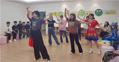 团课上,主持人、该校援疆教师何静现场讲述他们夫妻两人踏上援疆路的经历。随后,何静老师利用自身专业所学,手把手地认真教授大家学跳新疆舞的基本动作,同学们欣赏着新疆歌舞,将现场气氛推向高潮。团课现场,苗族、土家族、维吾尔族、藏族等各民族学生从生活、学习到心理等方面结成“对子”相互帮扶。