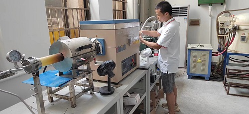 “这个钨粉旋转的速度快了,金刚石还有两个面没镀上钨。”“这个面,钨粉镀得不均匀。”……在长沙市望城区的加工中心,阳展望与队员陈月芬研究金刚石表面改性的问题,经常一站就是3个小时。他们的目标是借助自己研发的金刚石表面改性装置,将50-400微米大小的金刚石的12个面均匀地镀上钨粉,从而减少界面热阻,使金刚石与铜更好地结合。