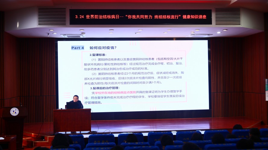 本网讯 2024年3月24日是第29个“世界防治结核病日”,今年的活动主题是“你我共同努力,终结结核流行”。3月20日下午,学校联合学士街道社区卫生服务中心,在图书馆报告厅组织开展结核病防治知识专题培训。本次培训由岳麓区疾控中心邹林友医师主讲,学校后勤处处长李陟威主持。各部门疾病防控联络员、二级学院分管学生工作副书记、全体辅导员和班主任老师、校医务室医务人员等参加培训。