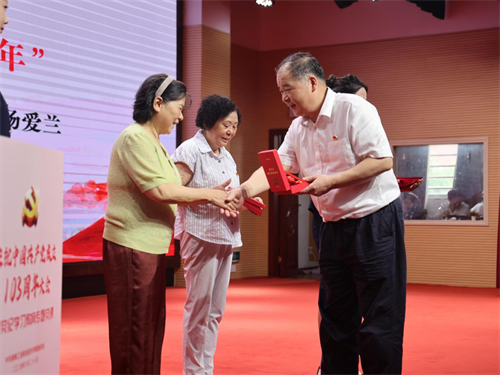 学校党委书记刘建湘同志为“光荣在党50年”老党员代表颁发纪念章,杨丕娣等4人获得纪念章。