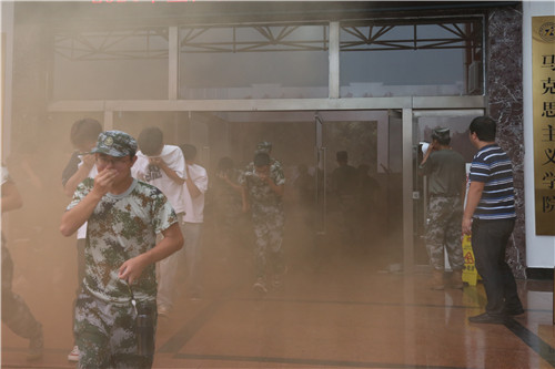 知识讲座和实操培训结束后,同学们进行消防疏散演练。警报声响起,同学们立即进入状态,纷纷捂住口鼻,以低头弯腰的姿势有条不紊地从尚善楼、知行楼转移到学校足球场。整个演练过程大家动作规范,整齐有序,各营各连队组织迅速,清点人数后向消防演练总指挥报告。