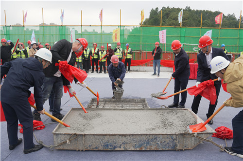 在全场共同倒数声中,各位嘉宾手持红铲共同完成浇筑仪式,标志着润霖实训中心大楼主体结构圆满封顶。