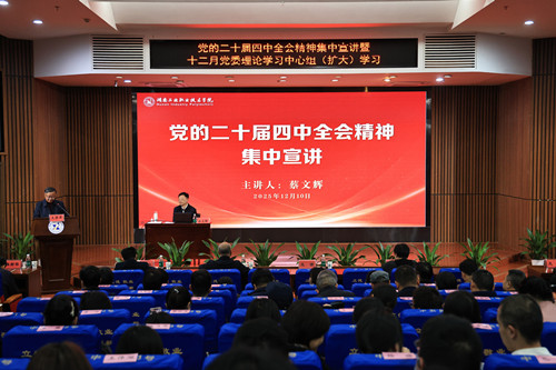 本网讯 12月10日,党的二十届四中全会精神集中宣讲暨12月党委理论学习中心组(扩大)学习在图书馆报告厅举行。省委宣讲团成员、省委党校(湖南行政学院)副校(院)长、湖南韶山干部学院院长蔡文辉作宣讲报告。学校党委班子成员、校领导,科级以上干部,马克思主义学院全体教师参加。党委书记王璞主持报告会。