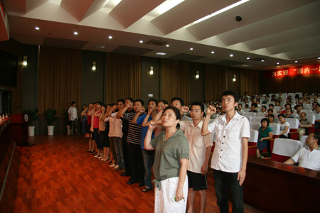 大会在庄严的国歌声中拉开序幕。学院副院长王柏林教授宣读了包括13名教职工、315名学生在内的新党员名单。随后,新党员代表在学院纪委书记李玲的领誓下,举起右手,面向鲜红的党旗,庄严宣誓。周璞同志代表328名新党员发言。她表示所有新党员们将牢记今日的誓言,始终如一的保持党员的先进性,不断加强党性修养,以优异的成绩回报党和社会,成为一名合格的中共党员。