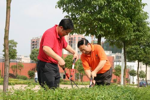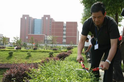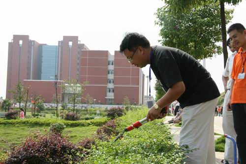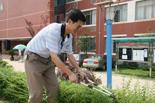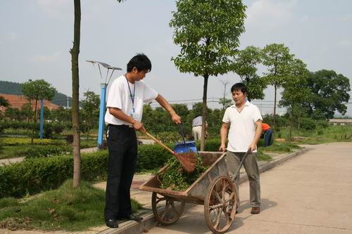 炎炎烈日考验着每个人的耐力,汗水湿透了他们的衣襟,模湖了他们的视线,但他们没有停止脚步,用手拭去眼角的汗水与尘土,继续低头苦干,如一道美丽的风景线定格在校园中。