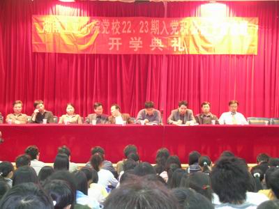 4月11日晚,我院党校第22--23期入党积极分子培训班开班典礼于大学生活动中心举行。我院党委副书记兼党校校长龙承海、党校副校长杨凯、宣传统战部部长兼党校副校长廖哲智及各系党总支书记出席了典礼。开班典礼由党校副校长杨凯主持。