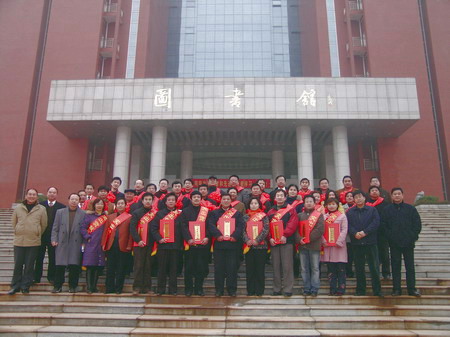 院领导与获奖者在图书馆前合影留念