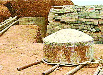 圆形柱状石砌建筑位于墓道的中轴线上,共6层,由60多块石头砌成
