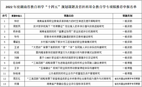 根据湖南省教育厅《关于做好湖南省教育科学“十四五”规划2022年度课题组织申报工作的通知》(湘教科规通〔2022〕1号)和湖南省哲学社会科学规划基金办公室《关于做好2022年度湖南省社科基金教育学专项课题申报工作的通知》(湘教通〔2022〕19号)的相关要求,经请示,本次课题采取第三方盲审评审方式,评审结果直接反馈至纪检邮箱。根据校外专家评审结果,经学校领导审核批准,拟从70份申报材料中按评分排名择优推荐我校“湖南省高等职业教育资源承载力的时空演进及提升策略研究”等11项课题申报2022年省教育科学规划课题和“‘三高四新’战略背景下装备制造类职业本科教师社会服务能力提升与对策研究”等2项课题申报2022年湖南省社科基金教育学专项课题,特此公示。如对评审结果有异议者,请在公示期内(4月11-4月15日)以书面形式向学校科技处反映。科技处联系电话:0731-82946157。