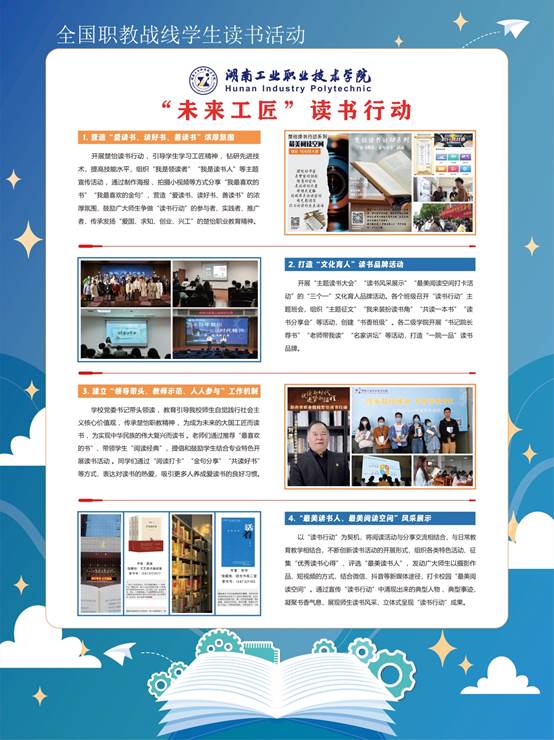 在全国职业院校“未来工匠”读书行动展示活动现场,我校从四个方面向参会嘉宾展示读书行动成效。一是营造“爱读书、读好书、善读书”的浓厚氛围,鼓励广大师生争做“读书行动”的参与者、实践者、推广者,传承发扬“爱国、求知、创业、兴工”的楚怡职业教育精神。二是打造“文化育人”读书品牌活动,开展“主题读书大会”“读书风采展示”“最美阅读空间打卡活动”的“三个一”文化育人品牌活动。三是建立“领导带头、教师示范、人人参与”工作机制,学校党委书记带头领读,老师们通过推荐“最喜欢的书”、带领学生“阅读经典”,提倡和鼓励学生结合专业特色开展读书活动,同学们通过“阅读打卡”“金句分享”“共读好书”等方式,表达对读书的热爱。四是开展“最美读书人、最美阅读空间”风采展示,将阅读活动与分享交流相结合,与日常教育教学相结合,不断创新读书活动的开展形式,凝聚书香气息,展现师生读书风采,立体式呈现我校“读书行动”成果。