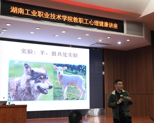 本网讯 近日,学校“心理压力及其应对技巧”教职工心理健康讲座在图书馆报告厅举行,由中南大学唐海波教授担任主讲。学校党委副书记成涛、副校长侯新华,学校270余名教职工认真聆听并积极参与互动。讲座由组织人事部(教师工作部)部长杨文斌主持。