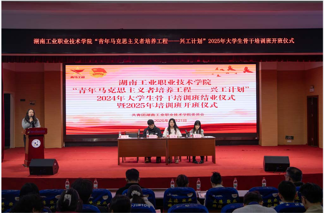 仪式在庄严的国歌声中拉开帷幕。现场,校团委老师宣读了《关于2024-2025学年“青年马克思主义者培养工程——兴工计划”大学生骨干培养班准予结业和表彰优秀学员的决定》,介绍了2025年培训班实施方案、培训班学员守则,并对培训内容及安排进行了详细说明。