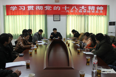 汽车工程学院副院长任成高详细解读并组织学习了党的十八大上通过的新修订后的《中国共产党党章》和中共中央《关于改进工作作风、密切联系群众的八项规定》等有关内容。