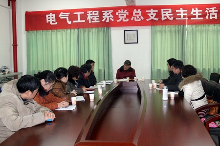 1月8日上午,电气工程系党总支在党员活动室召开了民主生活会。会议主题是:学习贯彻党的十八大精神,切实加强领导班子思想和作风建设。参加会议人员有系领导班子、教研室主任、干事、教师代表等,学院刘继平副院长出席了会议。会议由电气工程系党总支副书记周猷主持。