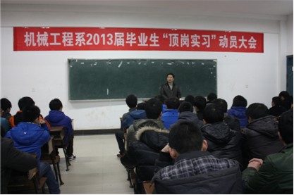 12月18日晚,机械工程系召开2013届毕业生顶岗实习动员大会。大会由机械系副主任申奇志和系党总支副书记王俊主持,各专业教研室主任、毕业班辅导员和2013届毕业生参加了本次动员大会。