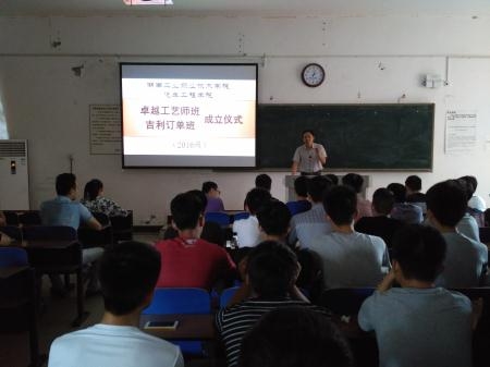 本网讯 为推进应用型人才的培养模式改革,深化校企合作,充分发挥学校与企业双方优势,6月27日下午,我校汽车工程学院2016级吉利订单班与卓越工艺师班成立仪式在第二教学楼104教室举行。汽车工程学院院长何忆斌、汽运教研室主任易宏彬、部分专业课教师、2016级学生辅导员以及全体吉利订单班与卓越工艺师班学生出席成立仪式。仪式由李琼老师主持。