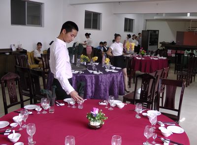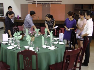 本网讯 为积极营造专业竞赛氛围,促进专业建设与发展,加强校企合作,提升实践教学水平,调动学生学习专业的积极性,商贸旅游系举办的2014年度中餐摆台比赛于6月11日在第2实训楼6楼中西餐厅实训室开赛。