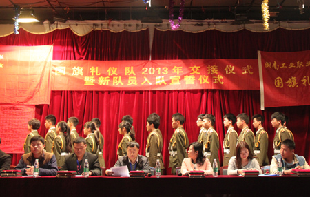 12月5日晚,我院国旗礼仪队2013年交接仪式暨新队员入队宣誓仪式在大学生活动中心隆重举行。学生工作处、院团委相关负责人及院团委各部门的新老干部出席仪式。