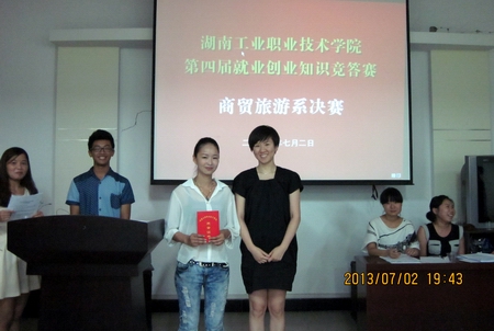 为了丰富校园文化,增强大学生就业创业知识储备,展现当代大学生良好的精神面貌和气质形象,全面拓展大学生的综合素质,7月2日,商贸旅游系在五教615举行了湖南工业职院第四届就业创业知识抢答赛系部决赛。商贸旅游系党总支副书记龙凌、杨甜老师、刘超老师、毛一老师等出席了此次大赛。