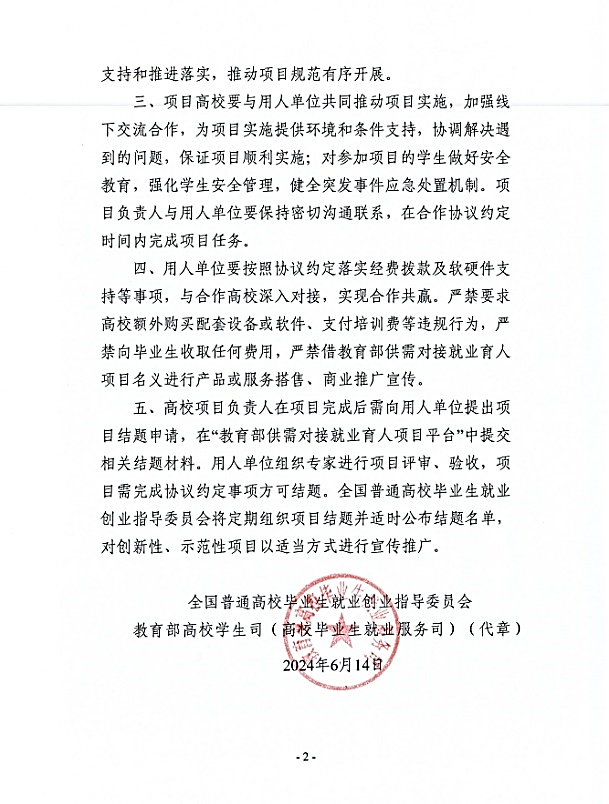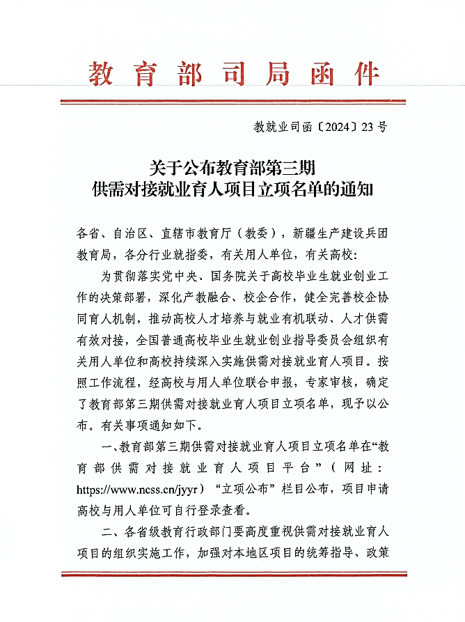 本次教育部第三期供需对接就业育人项目申报工作,在招生就业处的指导下,学院认真组织,各专业教研室积极参与,在前期开展人才培养与学生就业调研、校企合作对接、申报方案制定等准备工作的基础上,确定了“重点群体就业帮扶项目”、“定向人才培养培训项目”、“人力资源提升项目”三种就业育人项目类型。