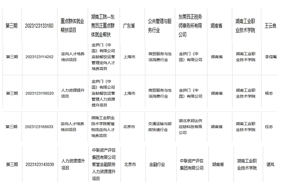 2024年6月14日,教育部第三期供需对接就业育人项目公布立项名单,我院“东莞百正重点群体就业帮扶项目”、“智慧物流定向人才培养项目”、“金拱门有限公司连锁餐饮运营管理定向人才培养项目”、“金拱门有限公司连锁餐饮运营管理人力资源提升项目”和“中联资产评估集团有限公司智慧金融服务人力资源提升项目”5个项目成功立项。