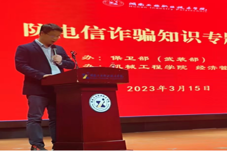 为进一步增强学生的法律意识,让广大学生认清新型电信诈骗犯罪的本质和手段,切实提高反诈反骗意识和能力,3月15日下午,由学校保卫部(武装部)主办,机械工程学院与经济管理学院承办的春季防电信诈骗专题讲座在1102大学生活动中心开展。讲座由湖南省反诈专家库成员、长沙市反诈中心宣传负责人翟安警官主讲,机械工程学院、经济管理学院共400余名师生代表参加。