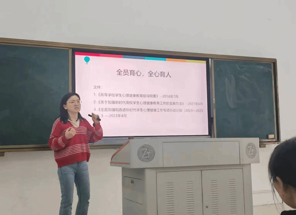 随后,张秋亮主任结合国民心理健康发展报告,分析了当下大学生心理健康状况,介绍了《全面加强和改进新时代学生心理健康教育工作专项行动计划(2023-2025)》等国家政策、文件,指出加强心理健康教育的重要性与紧迫性。接下来,她从“三低、三无、三自、一失”等方面详细介绍了高校心理危机常见信号、影响学生心理的应激事件类型以及“春季”“大考前”“重要节日前后”等关键时间节点等,强调在课堂教学中老师们要善于走近学生、倾听学生、了解学生、发现学生。最后,张主任指出,教职工是教书育人主体,必须牢固树立“身心同健康”意识,坚持“三个关注”,做到“三个避免”,贯彻落实“早发现、早报告、早研判、早预防、早控制”的“五个早”机制。