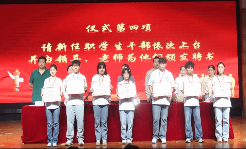 随后,机械工程学院机制与检测学生党支部书记罗诗楠宣布了新一届团总支学生会的任职名单,智能制造学生党支部书记何科英宣读优秀个人及优秀部门名单。在热烈的掌声中,主席台领导老师为优秀学生干部颁发荣誉证书,为新聘学生干部颁发聘书。这不仅是对过往努力的肯定与表彰,更是对未来的责任传递,激励着新老团学干部传承优良传统、勇挑重担,在新征程中奋勇前行。
