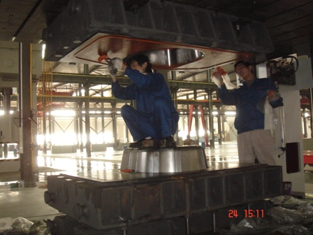 模具与计辅教研室易延辅老师和企业员工一起安装调试模具