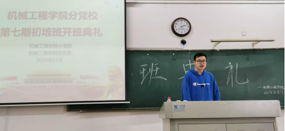 2020年11月17日,机械工程学院分党校在2103阶梯教室举办第七期党史党建初培班开班典礼暨第一堂党课。学院党总支书记马跃龙、机制与检测学生党支部书记李雪艳、团学指导老师杨晶及各辅导员出席开班典礼。本次典礼由机械工程学院组织员邓松林主持。学院全体入党积极分子、学生党员、发展对象共计300余人参加了本次会议。