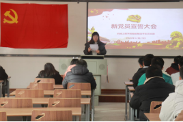 机械工程学院党总支书记马跃龙在仪式上致辞,对刚刚宣誓的新党员表示热烈祝贺!同时强调,入党不仅是形式上入党,更要思想上入党,要在实际行动中入党。我们要争做有理想抱负的共产党员,仰望星空的同时也要脚踏实地,从小事做起,从细节做起,严格要求自己,所谓“一屋不扫,何以扫天下”。带头学习提高、带头争创佳绩、带头服务群众、带头遵纪守法、带头弘扬正气,为学校、社会、国家做出应有贡献。